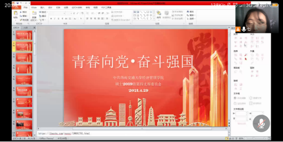 2021年4月29日晚八点,英国上市365官网硕士2019级第四党支部依托腾讯会议平台开展了线上党组织生活会。本次会议以“青春向党·奋斗强国”为主题,由邹嘉瑞同志主持,旨在带领大家回顾与学习中国共产党的光辉历程,调动全体党员学习党史的积极性。