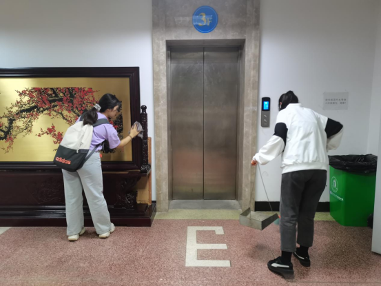 下午两点集合后,莫代玉同志将全体同学分为三个小组,分别在组长樊乐同志、谢雨桐同志和汪梦妤同志的带领下清扫零号教学楼二楼公共区域、零号教学楼各楼层以及四号教学楼各楼层。同学们分工明确地进行整理桌椅、擦拭墙面和清除废弃的活动横幅等工作,切身地体会了劳动的不易。经过这次劳动实践,各位同学更加深切地感激身边的劳动者,再一次明确了回馈社会的信念。