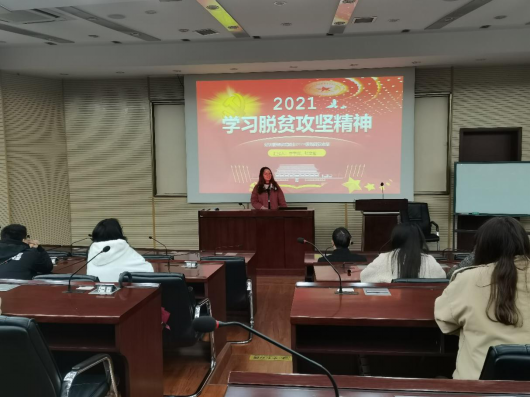 会议正式开始后,李丰翼同志上台发言说明此次会议主题是“学习脱贫攻坚精神”,并简要介绍今天主要学习的四方面内容。首先由李丰翼同志带领学习前两方面,主要讲述了脱贫攻坚所定下的总体目标以及10项具体指标,之后再详细讲解了2020年脱贫攻坚的全面胜利。通过PPT、视频等多样化的方式来介绍此次胜利,并且列举了教育,住房等方面的脱贫政策实施带来的好处。其次是由张文仙同志带领学习后两方面内容,主要明确了脱贫攻坚精神就是习近平总书记深刻阐述的“上下同心,尽锐出战,精准务实,开拓创新,攻坚克难,不负人民”的精神。同时列举出了很多全国脱贫攻坚楷模,例如黄文秀、张桂梅、李玉等,他们都在各自的邻域为脱贫攻坚战做出了自己的贡献,他们就是脱贫攻坚精神的传承者。最后张文仙同志还带领学习了最近召开的十三届全国人大四次会议中的有关脱贫工作如何继续推进的内容。指明虽然2020年经过全党全国各族人民共同努力,我国脱贫攻坚战取得了全面胜利,区域性整体贫困得到解决,完成了消除绝对贫困的艰巨任务,但解决发展不平衡不充分的问题仍然任重道远,接下来更需要做好巩固拓展脱贫攻坚成果同乡村振兴有效衔接的各项工作。