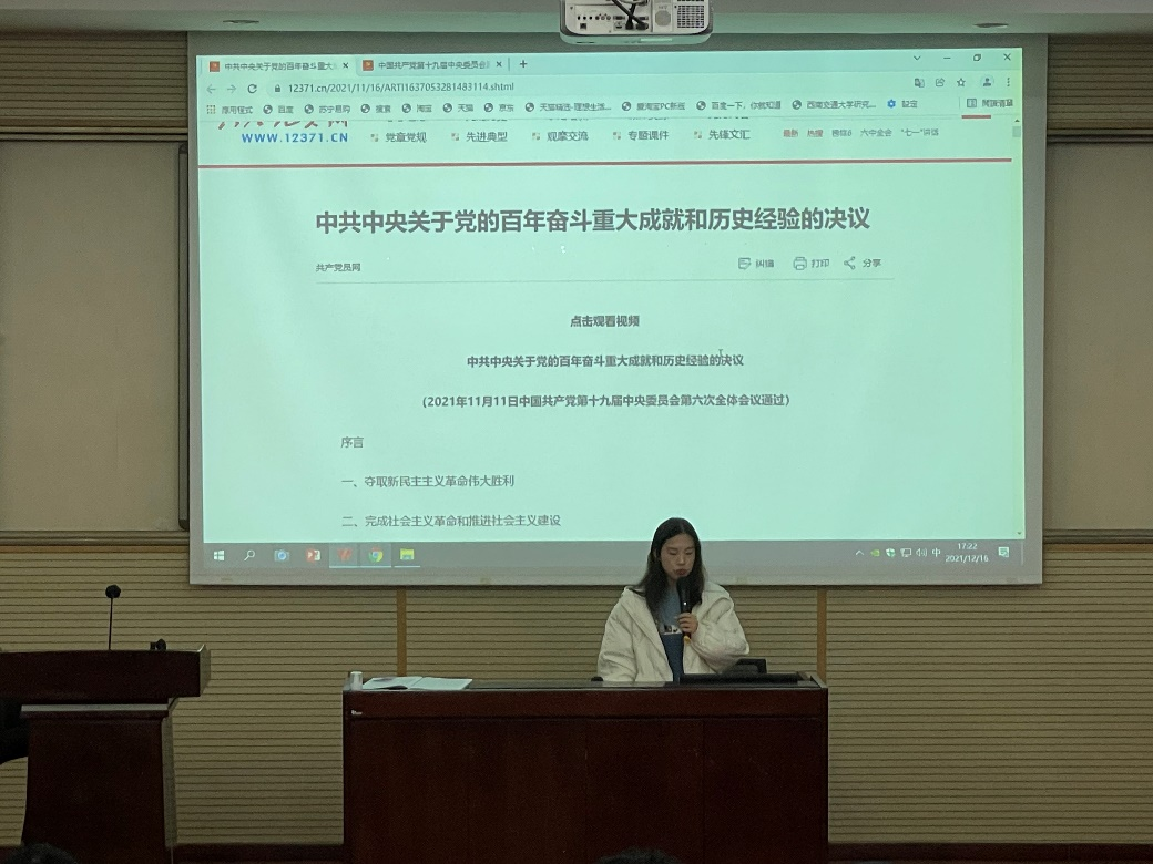 党支部副书记薄慧同志带领支部成员学习中共十九届六中全会公报及审议通过的两个决议:《中共中央关于党的百年奋斗重大成就和历史经验的决议》和《关于召开党的第二十次代表大会的决议》。