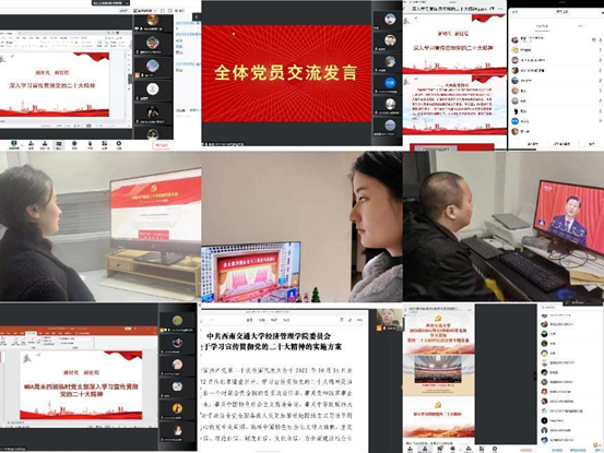 2022级EMBA临时党支部分成四个党小组进行分组学习,采取线下线上、自学领学、读报告听报告相结合的方式开展党的二十大精神学习和讨论。每位党员认真书写学习感受,为学习贯彻党的二十大精神奉上新答卷。党员同志们通过学习一致认为,时代赋予了我们重要的历史任务,使命光荣、责任重大,要把认真学习贯彻党的二十大精神作为义不容辞的政治责任,并坚持在学懂、弄通、做实上下功夫,从中掌握解决问题、推动工作的“金钥匙”。作为在职研究生,要在学院党委的带领下继续认真学习领会党的二十大精神,认真完成学业并积极在工作中实践;要胸怀赤诚、自信自强、全身心投入,不断提升自己、奉献自己,积极参与研究谋划各自推进中国式现代化建设的场景,进一步明确发展目标,制定行动计划,勇于攻坚突破,自觉成为党的二十大精神的学习者、宣传者和实践者,为中国式现代化事业贡献个人更多智慧和力量。