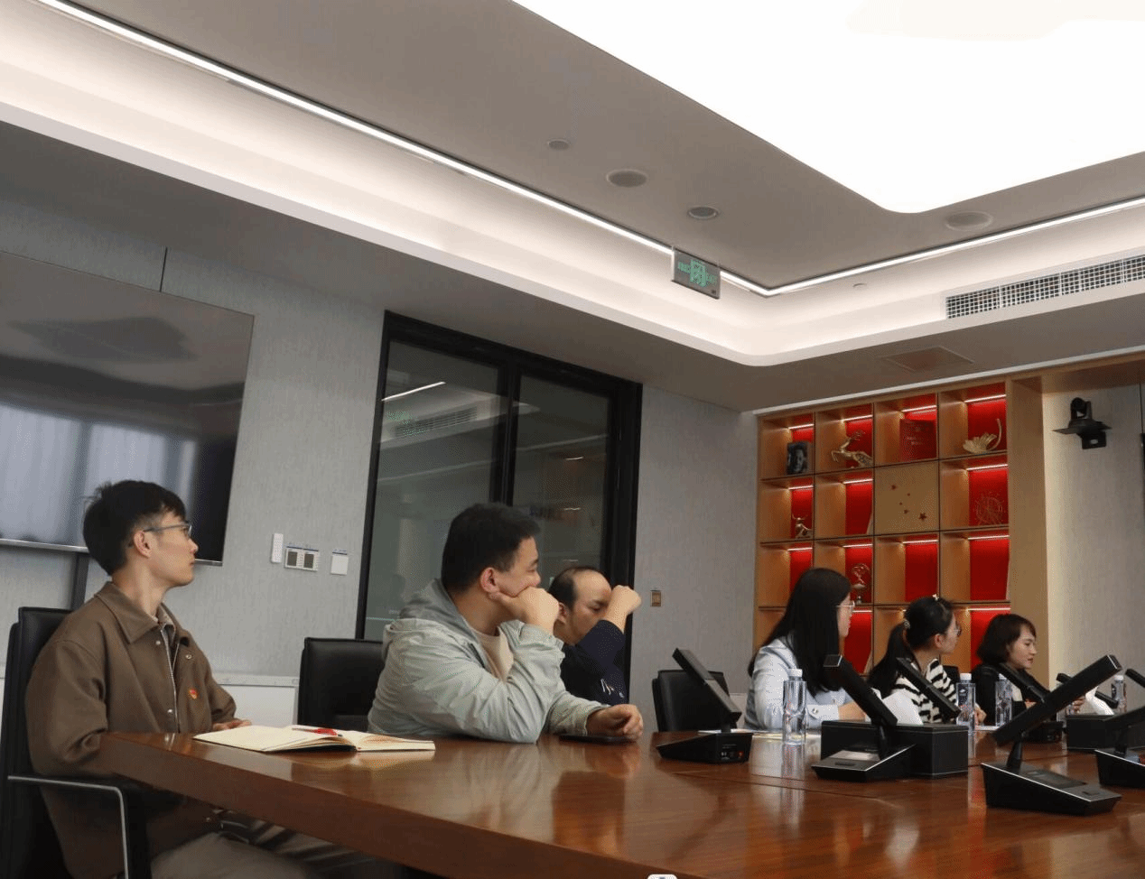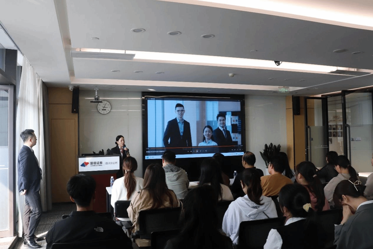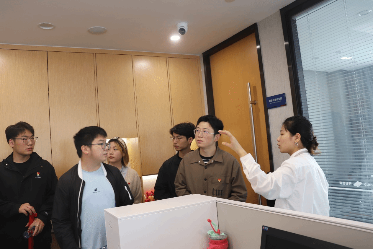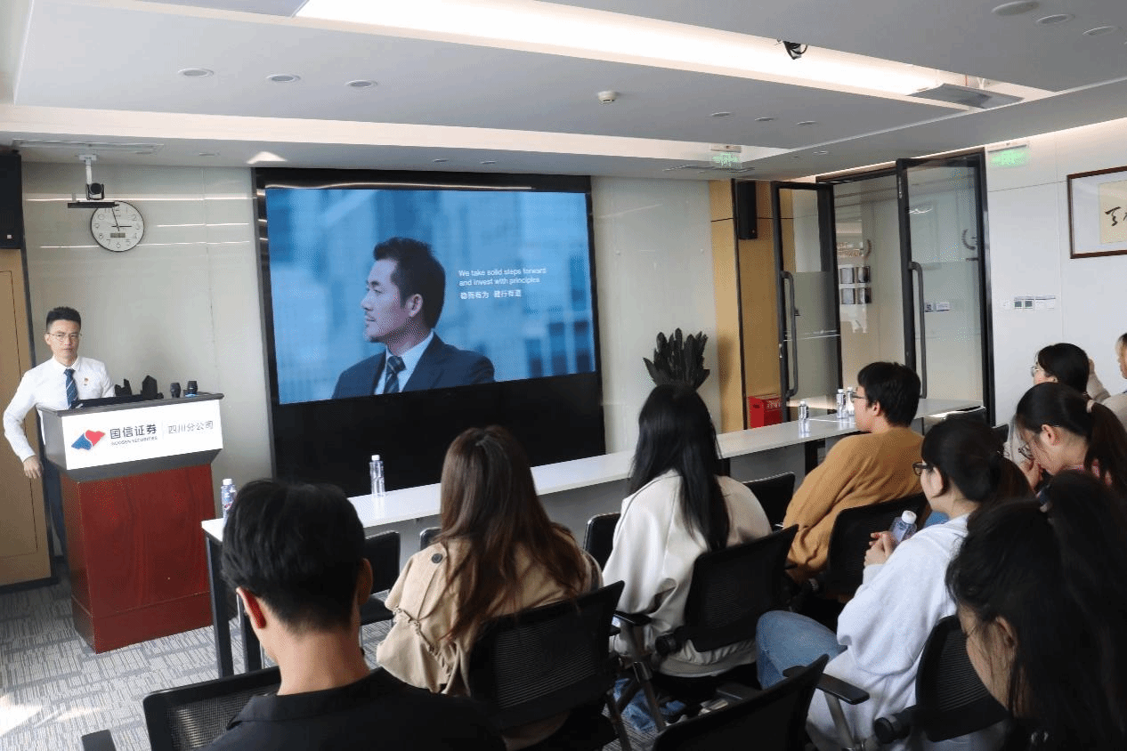 抵达后,国信证券的领导和工作人员热情接待,并对365官网师生的到来表示热烈欢迎。随后,大家在工作人员的带领下进入会议室落座,国信证券理财三部的周圆皓经理简要介绍了此次活动的流程,本次党建共建活动正式开始。