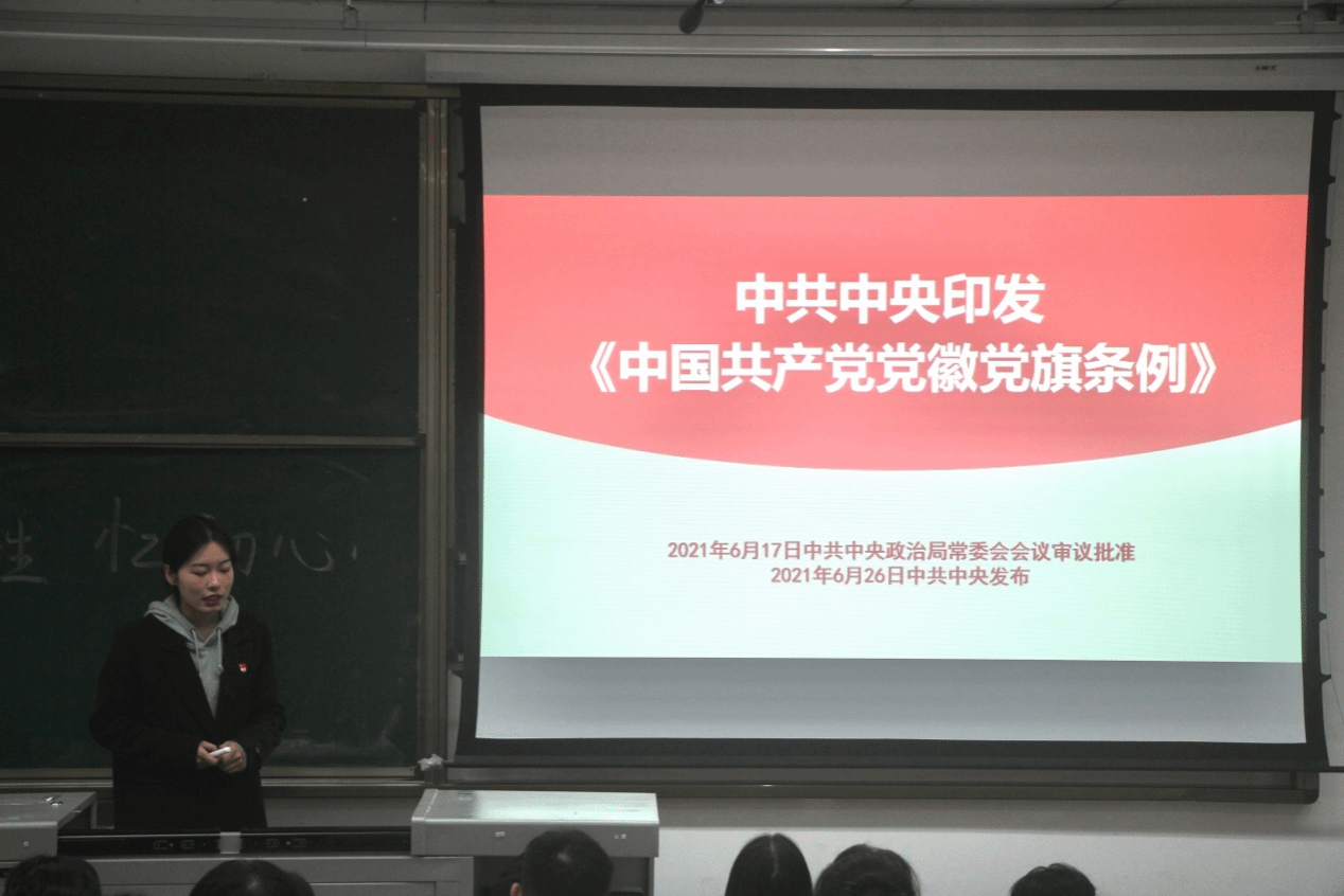 紧接着,本科第四党支部党员罗慧带领学习《中国共产党党徽党旗条例》。中国共产党的党徽党旗是中国共产党的象征和标志。通过对《中国共产党党徽党旗条例》的学习,英国上市365官网本科党支部的同志们对党徽、党旗的明确用法、使用场合等都有了更深入的了解,规范党徽、党旗的使用,就是维护党的权威,是各级党组织和党员同志必须履行的政治责任。作为学生党员,应该坚定理想信念,不忘初心、牢记使命,努力学习,为实现中华民族伟大复兴贡献青春力量。