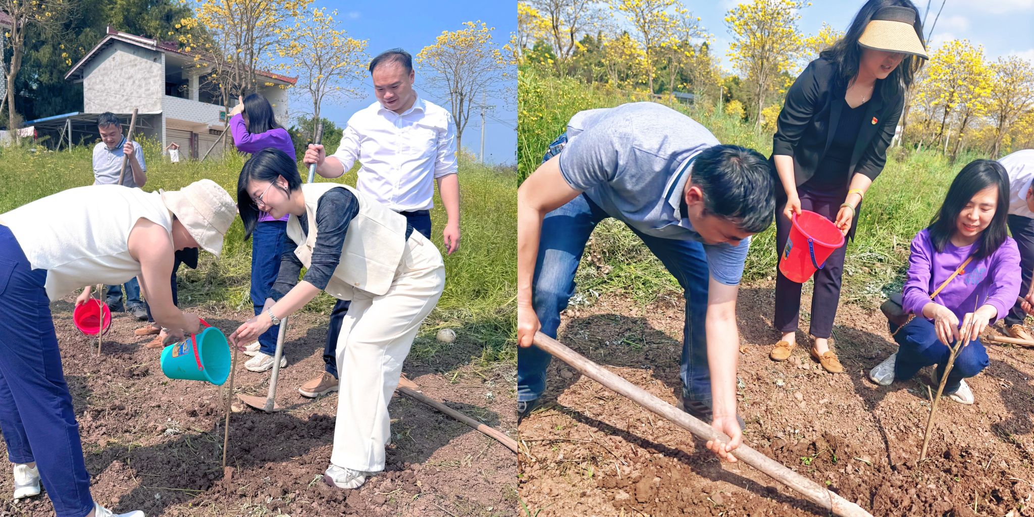 缅怀先烈活动结束后,双方党员共同开展了植树活动。在活动现场,大家分工协作,挥锹铲土、扶苗填坑、浇水灌溉,每一个环节都做得认真细致。经过一番辛勤劳动,一株株树苗在春风中昂然挺立,为大地增添了一抹新绿。