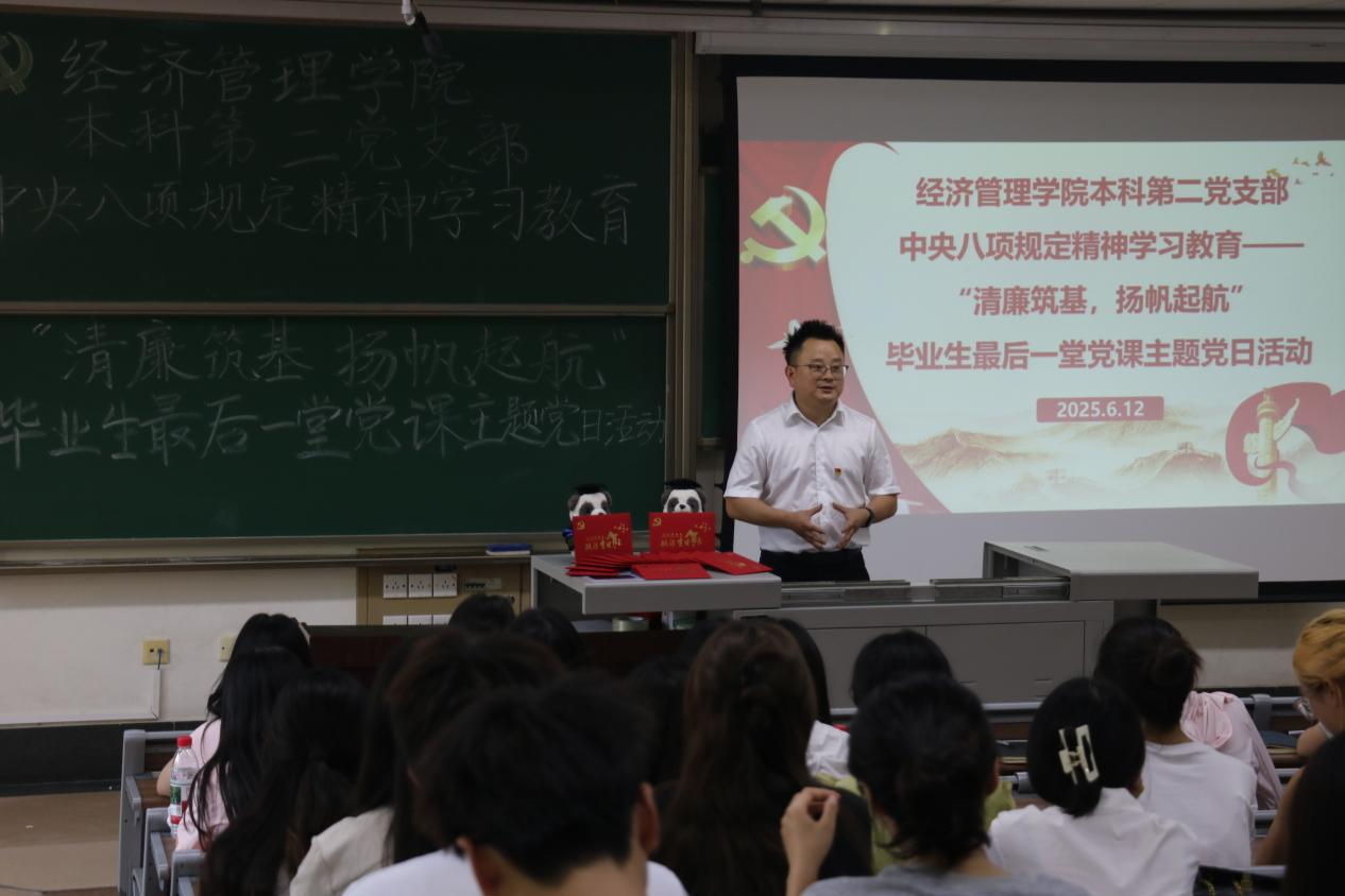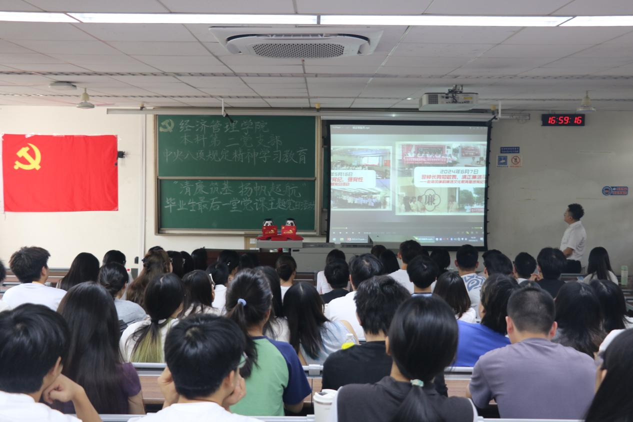 为深入贯彻中央八项规定精神学习教育,强化党员的廉洁自律意识,进一步增强毕业生党员的党性意识和社会责任感,6月12日,英国上市365官网本科第二党支部于J4310开展深入贯彻中央八项规定精神学习教育——“清廉筑基、扬帆起航”毕业生最后一堂党课主题党日活动。